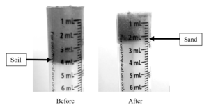 The test uses the measurements provided on the side of the syringe to estimate the percent of sand in a minus No. 4 soil specimen. The test compares a syringe filled with 4 ml of the specimen to a syringe containing the sand remaining after washing the fines out. Note that typically, the test will result in a value that is ±5% of the measured soil gradation.